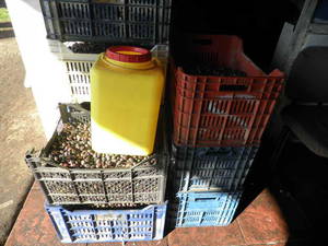 Итак, оливки собраны и доставлены в пункт назначения, то бишь переработки, где над ними сразу начинают "колдовать" — ссыпают в поддон и моют их.