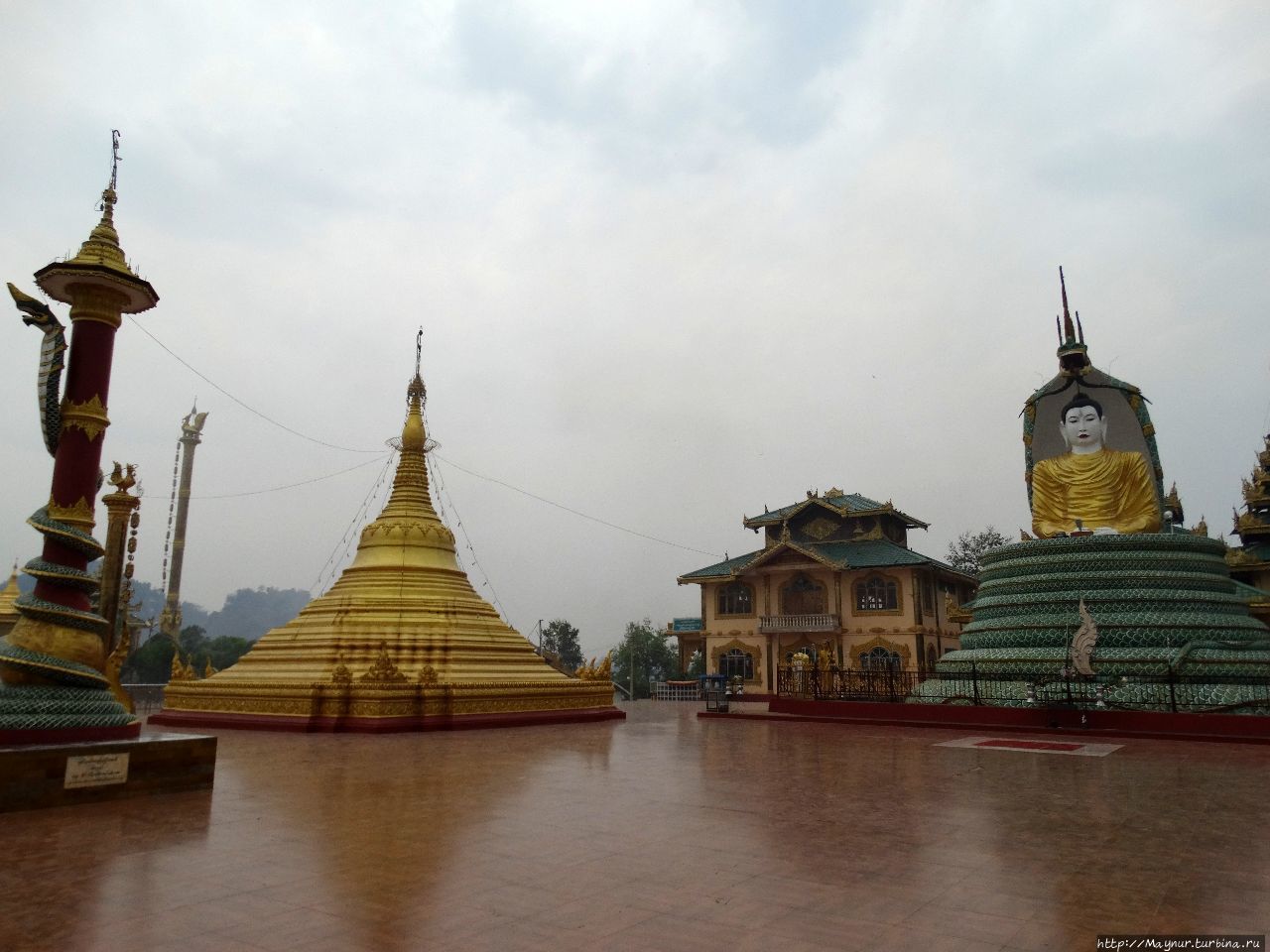 В центре круга вокруг внушительной колонны установлены четыре сверкающие статуи Будды.