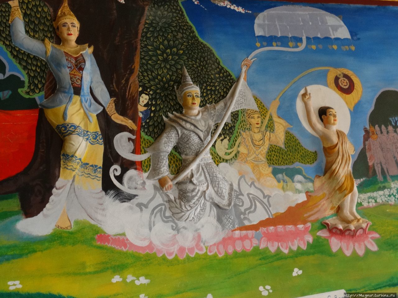 Я застыла от увиденного! Мы попали в огромное светлое круглое помещение, в котором по кругу стояли в три ряда колонны. На внутренних колоннах установлены красочные стенды из жизни Будды, очень яркие, разноцветные, одним словом — красивые.