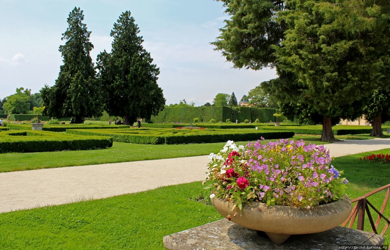 Прилегающая территория спереди от дворца выглядит как классический ухоженный цветники с газонами, прогулочными дорожками...