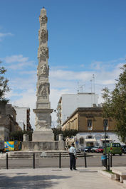 А вот и сам Оронцио на высоком столбе. Нижняя часть колонны – это привезенный из Бриндизи столб, когда-то обозначавший конец Аппиевой дороги. А сама статуя только выглядит золотой, а на самом деле сделана из оливкового дерева, обитого листами меди.