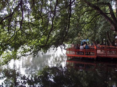 Место приятное. Большие деревья нависают широкими кронами над гладкой поверхностью небольшой речки, лодочники приглашают на прогулку, и повсюду плавают великолепные белые лебеди.
