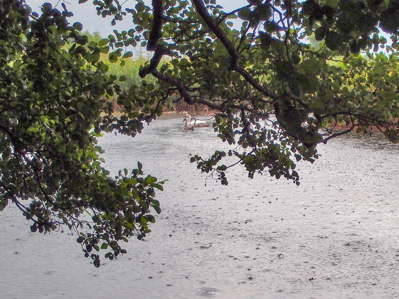 Здесь я впервые наблюдала интересную семейку — за красивыми лебедями-родителями неотступно следовали шесть гадких утят. "Утята" были уже совсем большие, не меньше, чем их мама и папа, только пока серыми, и, видимо, всё ещё чувствовали себя неуверенными детьми. Правда, мои фотографии оказались совершенно размытыми из-за начавшегося дождя. Так что пришлось искать эту семейку в интернете: