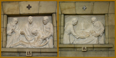 Под окнами расположены барельефы на темы сострадания, любви.