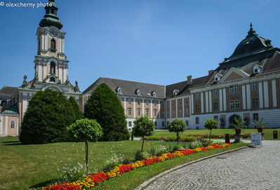 Мы постепенно "вкатываемся" в велосипед, ничего не болит, руки ноги целы, пьем водочку водичку. Мимо живописных полей, поднимаемся в горку в цистерцианский монастырь Wilhering. Усталости не чувствуем.