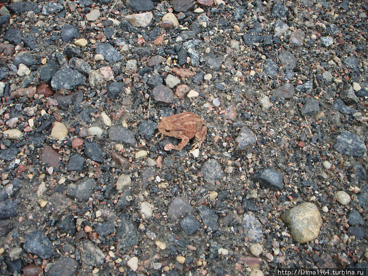 Лягушонок испуганно замер, прижавшись к гравийной дорожке, по которой мы собрались подняться на вершину холма, и постарался показаться небольшим камешком.