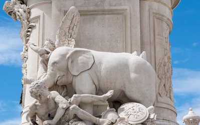 Слава, ведущая слона (представляющего Азию) над человеческой фигурой (представляющей Африку).Из интернета
