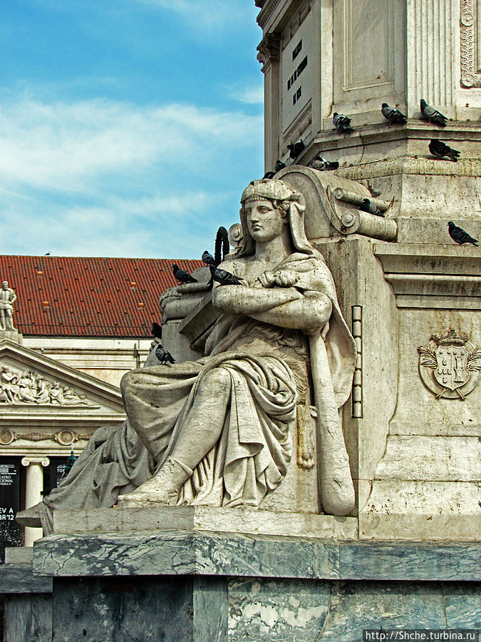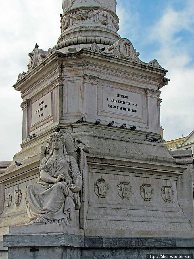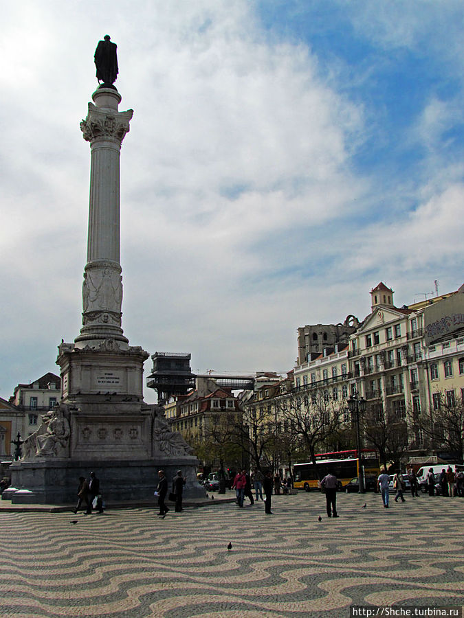 Но главная площадь должна быть одна. И это без сомнения площадь Россио. Россио — это историческое и народное название. Официальное название площади — площадь Педро IV (Praça де D. Pedro IV), одного из любимых португальских королей, ставшего и первым королем Бразилии Педро I. Именно ему в центре площади стоит высоченная колонна-монумент.