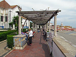 Оказалось, там находится тенистый сквер с красивым видом на реку, широкую здесь, как море. Внизу стояли военные корабли, а в самом сквере расположились художники, да пару местных заглянули просто посидеть в тишине и расслабиться. Удивило, что художники выставили здесь картины. Народу то нет. Трамвайная остановка, где высаживаются туристы, пару сотен метров выше. Кому торгуем? А потом подумалось. А может внизу на пешеходной Rua Aurea торгуют перекупщики, а сюда бегают за "добором"?