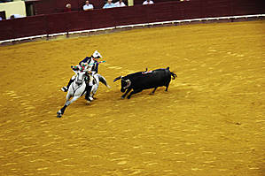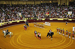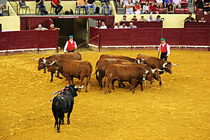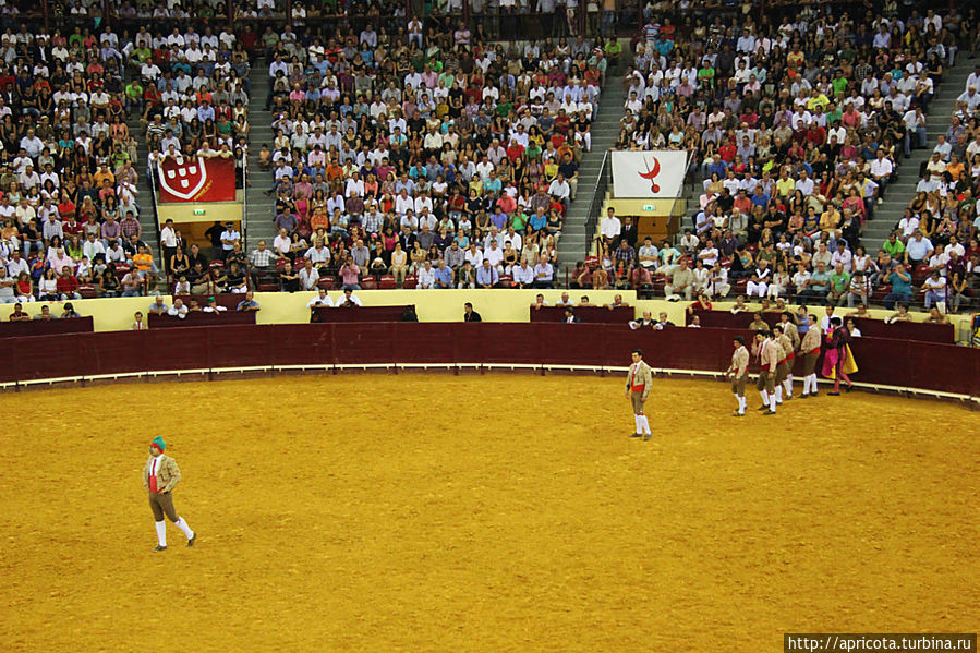 Это увлекательное 3х-часовое шоу, на котором,в отличие от испанского, быков НЕ убивают. И опять же, в отличие от испанской корриды, в португальской главные герои — всадники (кабальеро), а не тореадоры. Сама арена не слишком большая, трибуны переполнены, народ порой стоит даже в проходах.Коррида начинается с того, что зрители приветствуют всех участников, которые выходят на арену. Как я уже сказала, шоу длится 3 часа и состоит из двух частей. В каждой части участвуют 3 всадника и группа фуркадушей и бандарилейрушей, которые одеты в костюмы 18 — 19 веков.