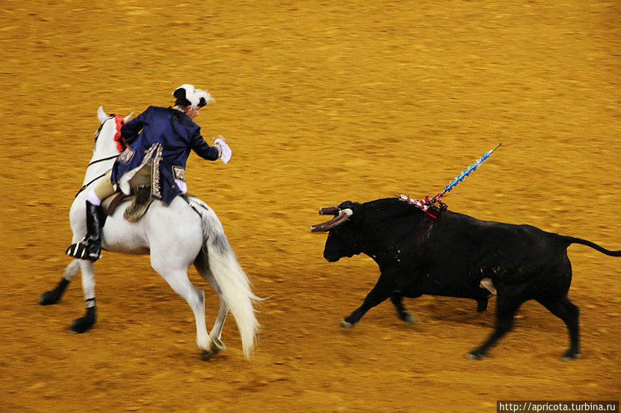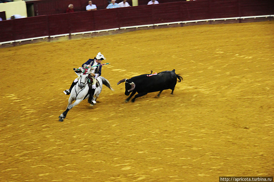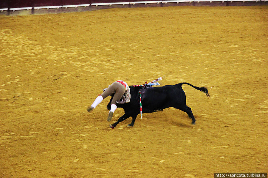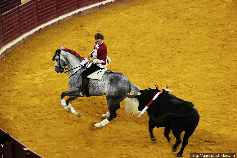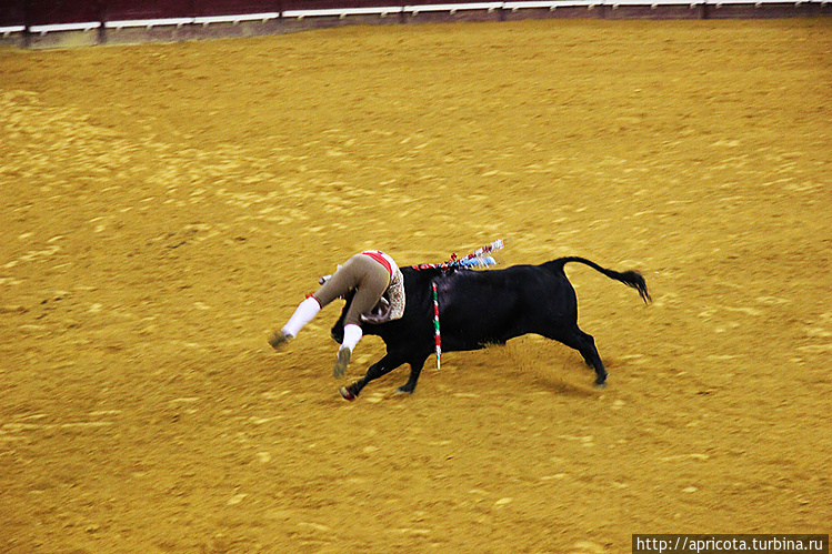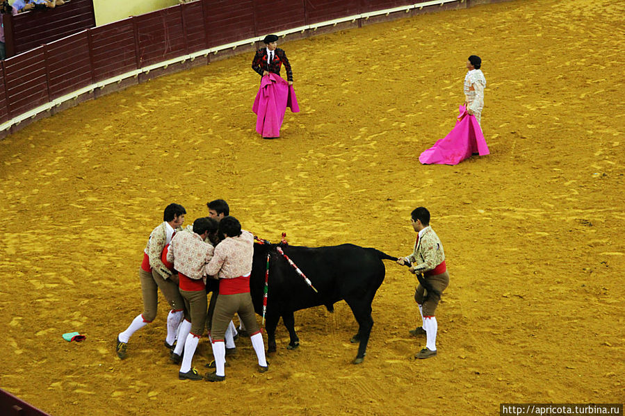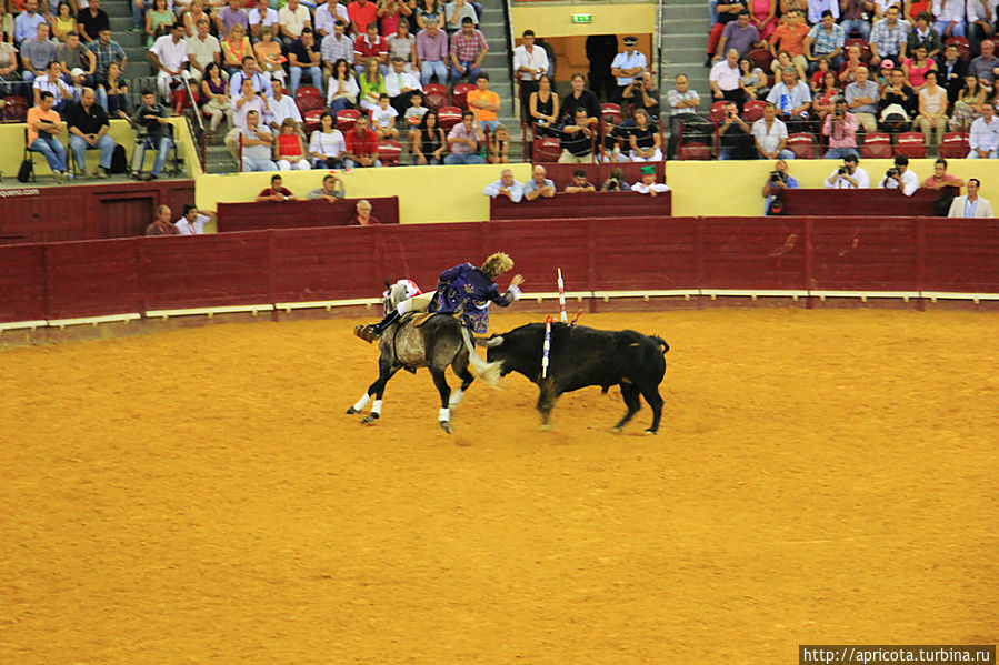 На каждого всадника приходится по одному быку. После того, как представят полную информацию о быке, за него принимается всадник. По плану, за отведенное ему время, он должен воткнуть пики разных видов в холку животного. Первые три пика с флажками, если всадник попадает в быка, из пика сразу же выскакивает флажок. После этого, за быка принимаются бандарилейруши, которые управляя ярко-розовыми плащами, должны поставить быка в удобное для захвата положение. Затем на арену выходит группа из 8 фуркадушей, которые пытаются голыми руками обездвижить разъяренное животное. Первый из мужчин пытается остановить быка. Запрыгивая на него, он повисает на его морде, ухватившись за рога. Ему помогают еще два фуркадуша. Другие четыре фуркадуша также помогают остановить быка, окружив его по бокам. А последний восьмой фуркадуш тянет быка за хвост. Выступление считается законченным, когда бык относительно "успокаивается" (если так можно сказать) и его уводят с арены. В завершение каждого представления, героям корриды не только аплодируют. Всадник и фуркадуши обходят арену по кругу, а зрители кидают им на арену свои вещи. Они поднимают эти вещи и бросают их обратно в толпу. Это считается ритуалом у португальцев, как бы "на счастье", как мы потом узнали. И так 6 раз — по 3 всадника в каждой из 2 частей.А теперь немного личных впечатлений! За 3 часа, которые длится шоу, мы с друзьями получили такие яркие эмоции и впечатления, что потом обсуждали это еще целую неделю. Некоторые из нас были на испанской корриде и сравнили ее с португальской. В итоге, пришли к выводу, что может испанская коррида более яркая и красочная, но все-таки португальская намного интереснее и более захватывающая за счет всадников. Кабальеро настолько ловкие и прекрасно обучены своему делу. Но на наш взгляд, все же самое интересное наблюдать за лошадью. Конечно, они подчиняются всаднику, но все же они тоже необыкновенные и по красоте, и по движениям.