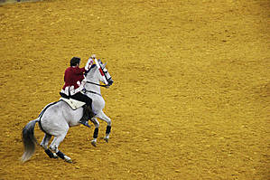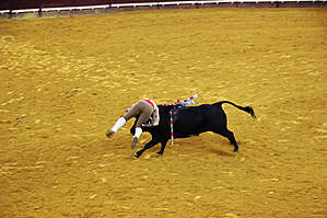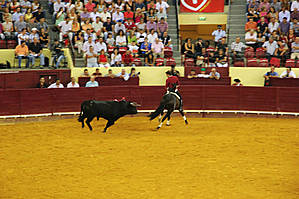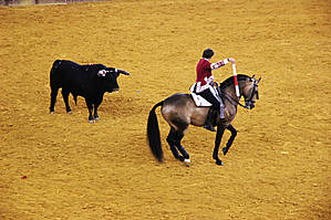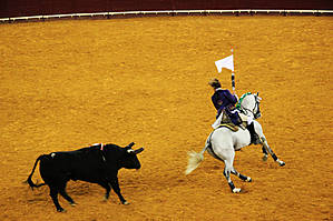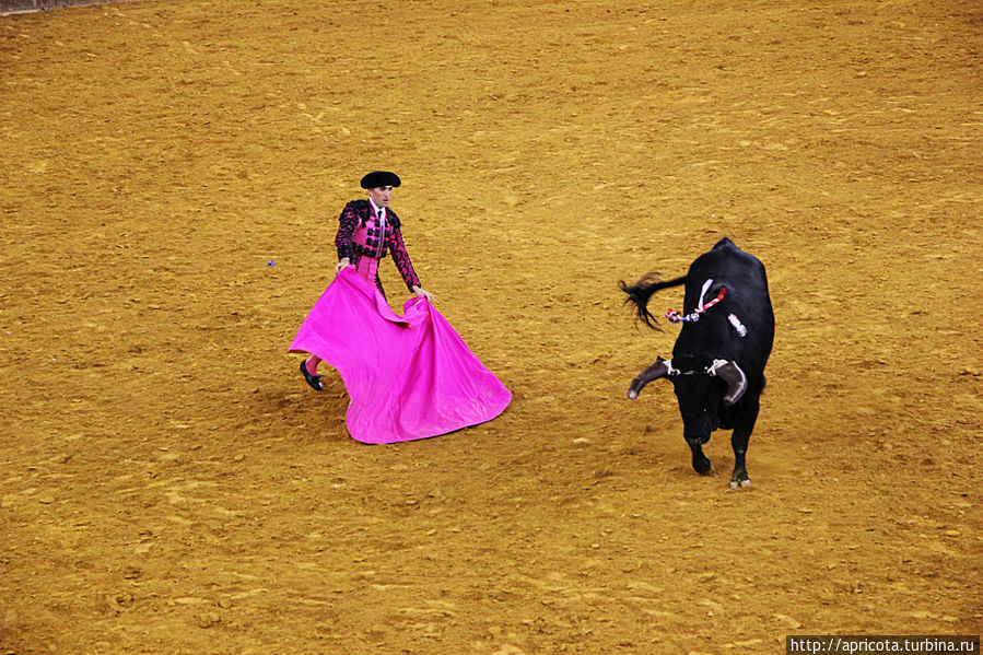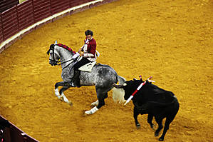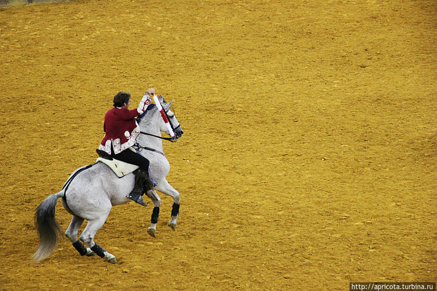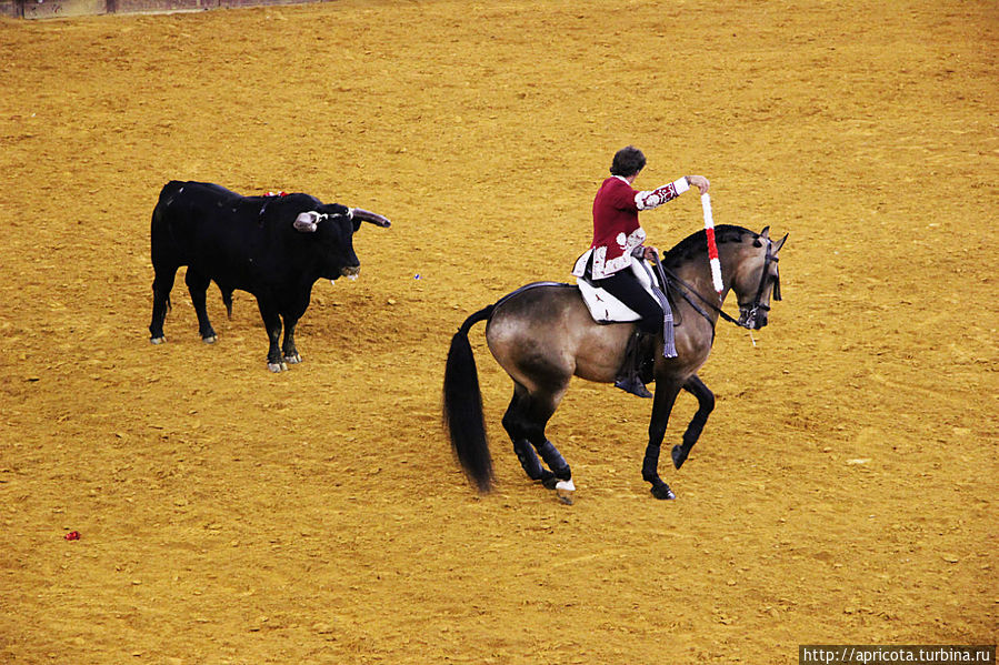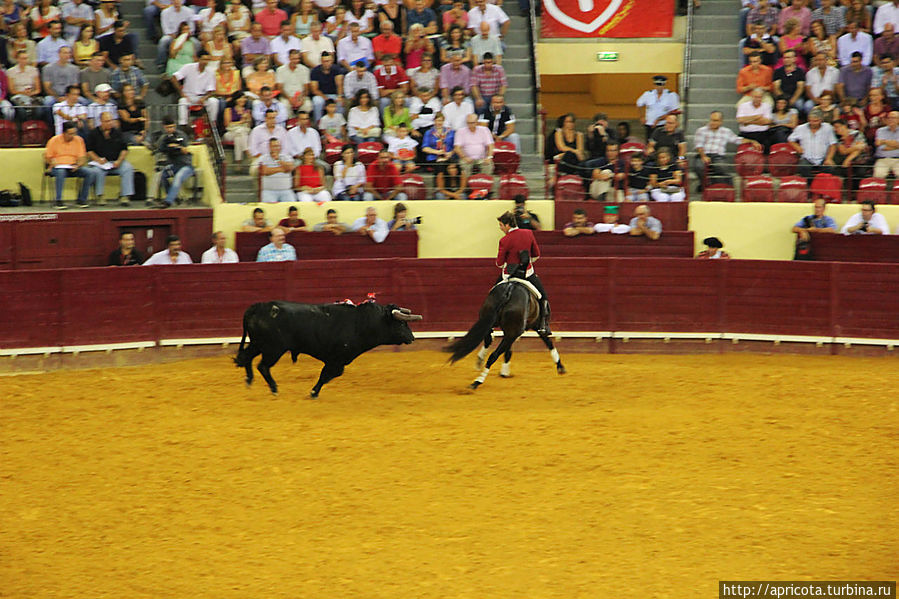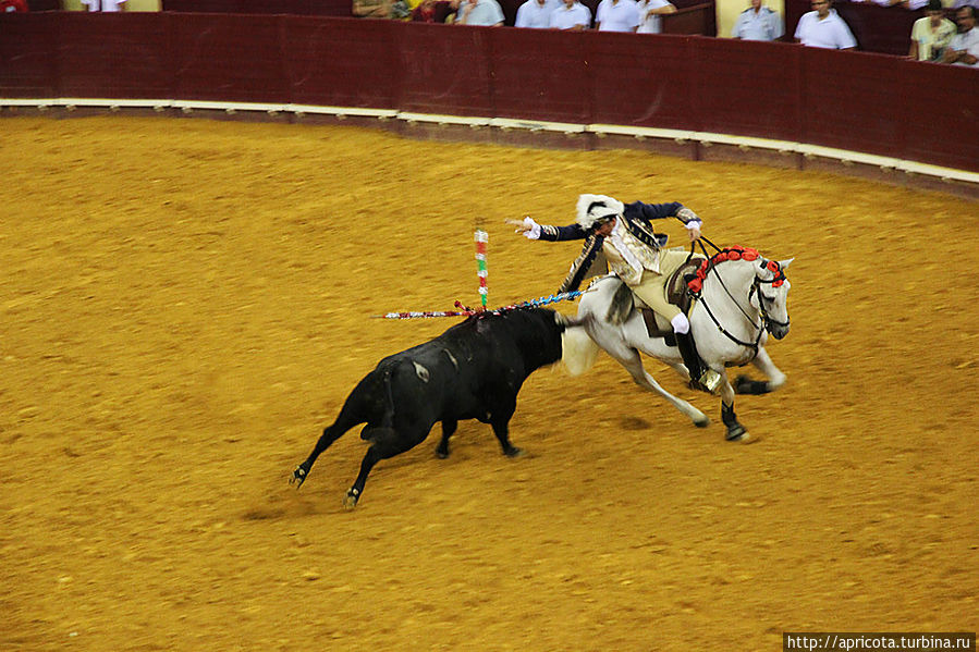 На каждого всадника приходится по одному быку. После того, как представят полную информацию о быке, за него принимается всадник. По плану, за отведенное ему время, он должен воткнуть пики разных видов в холку животного. Первые три пика с флажками, если всадник попадает в быка, из пика сразу же выскакивает флажок. После этого, за быка принимаются бандарилейруши, которые управляя ярко-розовыми плащами, должны поставить быка в удобное для захвата положение. Затем на арену выходит группа из 8 фуркадушей, которые пытаются голыми руками обездвижить разъяренное животное. Первый из мужчин пытается остановить быка. Запрыгивая на него, он повисает на его морде, ухватившись за рога. Ему помогают еще два фуркадуша. Другие четыре фуркадуша также помогают остановить быка, окружив его по бокам. А последний восьмой фуркадуш тянет быка за хвост. Выступление считается законченным, когда бык относительно "успокаивается" (если так можно сказать) и его уводят с арены. В завершение каждого представления, героям корриды не только аплодируют. Всадник и фуркадуши обходят арену по кругу, а зрители кидают им на арену свои вещи. Они поднимают эти вещи и бросают их обратно в толпу. Это считается ритуалом у португальцев, как бы "на счастье", как мы потом узнали. И так 6 раз — по 3 всадника в каждой из 2 частей.А теперь немного личных впечатлений! За 3 часа, которые длится шоу, мы с друзьями получили такие яркие эмоции и впечатления, что потом обсуждали это еще целую неделю. Некоторые из нас были на испанской корриде и сравнили ее с португальской. В итоге, пришли к выводу, что может испанская коррида более яркая и красочная, но все-таки португальская намного интереснее и более захватывающая за счет всадников. Кабальеро настолько ловкие и прекрасно обучены своему делу. Но на наш взгляд, все же самое интересное наблюдать за лошадью. Конечно, они подчиняются всаднику, но все же они тоже необыкновенные и по красоте, и по движениям.