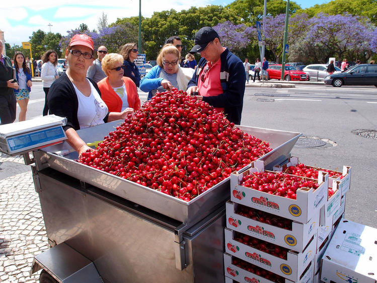 Направляясь ко входу в Заморский сад по улице Белен, мы увидели торговку, которая продавала вишню прямо с тележки. Такие крупные и сладкие ягоды! И тоже заморские, а что? Ведь лететь в Португалию мне пришлось над Средиземным морем, так что для меня здесь все сладости и радости — заморские :-) Мы купили целый пакет вишни и лакомились, пока гуляли в Заморском саду.