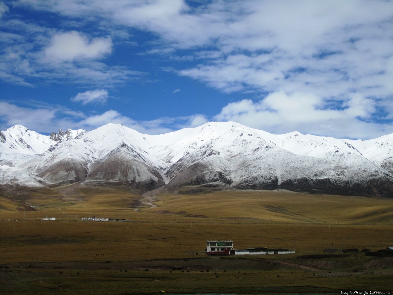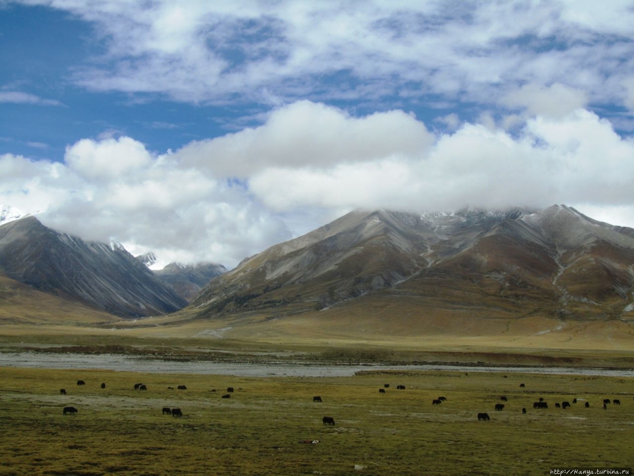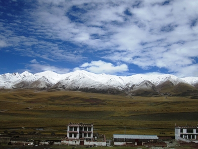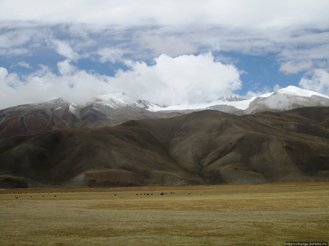 Складчатые горы, покрытые плюшевым нарядом, а за ними снежные утесы серьезной высоты, и мирно пасущиеся стада тибетских яков.