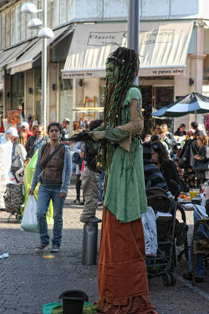 Прогулялись по набережной, поиграли в уличном спортгородке и углубились в центр. Рынок Кармель был следующим пунктом нашей прогулки. Освежившись свежевыжатым гранатовым соком мы углубились в тенистые ароматные торговые ряды. Прилавки ломились от овощей и фруктов. Футболки, магнитики и кипы, что еще нужно туристам. Горы клубники ранили нас в самое сердце. Специи проникали до самых потаенных уголков сознания а восточные сласти приказывали забыть о всех диетах мира. Выйдя с рынка, погрузились в атмосферу праздника, схожую с нашим Арбатом: вот мимо идет девушка из Аватара, а тут индеец поет национальные песни, стеклодув у вас на глазах плодит изумительных дракончиков, а кто-то, видимо чукча в чуме, ловит на зимнюю удочку в пимах, и варежках рыбешку в канализационном колодце.