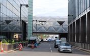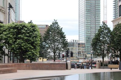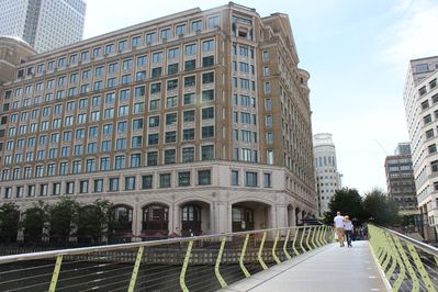 Когда-то сюда прибывали корабли из Канарских островов, а сейчас — станция метро Canary Wharf, на которую мы прибываем. Поднимаемся наверх и оглядываемся. Издалека видим стеклянный переход над дорогой между двумя офисными зданиями. Вот туда-то нам и надо.