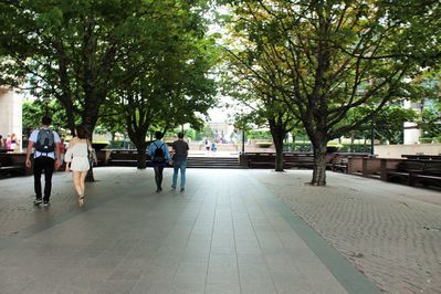 В каждой башне есть магазины, кафе, зоны отдыха. Много зелени, фонтаны и скверы, где можно отдохнуть в обеденный перерыв.