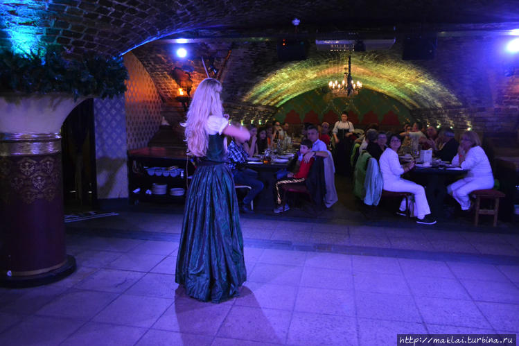 Теперь, что касаемо немаловажной составляющей банкета — еды. Фирменное блюдо заведения – непонятного состава постный суп, который принято есть здесь по-средневековому, то есть пить прямо из тарелки, макая, при желании, в него кусочки хлеба. Можно при разгулявшемся аппетите, завопив истошно "wench!" и сопровождая этот утробный возглас оглушительным стуком кулака по столу, потребовать, чтобы вам принесли ещё один горшок этого варева. На этот средневековый позывной непременно отреагируют весьма миловидные девушки.