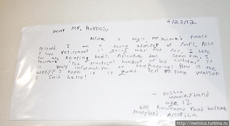 В этой же комнате на одном из столиков лежит альбом, в котором собраны некоторые из многих десятков тысяч писем, до сих приходящих на имя Шерлока Холмса с просьбами помочь либо дать совет. Забавно было его полистать)) Вот лишь несколько...