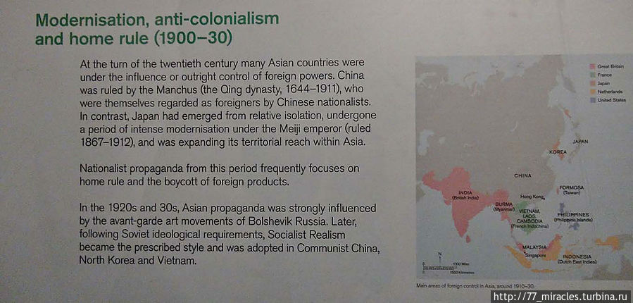 Именно такие мысли приходят в голову во время осмотра любопытной выставки "Искусство влияния" с подзаголовком "Азиатская пропаганда", которая проходит сейчас в Британском музее. И хоть посвящена выставка пропаганде или, как пишут устроители, политическому искусству таких далеких от нас стран как Индия, Китай и других в период с 1900 до 1976 годов, во всех плакатах, рисунках и расписных тарелках чудится что-то родное и знакомое с детства — рабочие и колхозницы, летчики-пилоты бомбы-самолеты, злобные империалисты и американская военщина, раскормленные пионерчики-хунвейбинчики, конечно же, олимпиада и голубь, блин, мира...