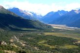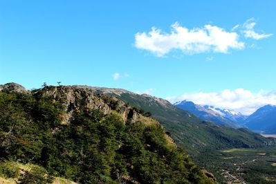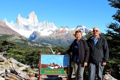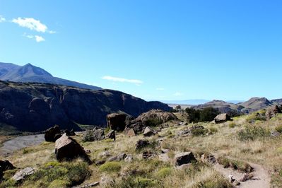 Эль-Калафате. Поскольку автобус заезжал сюда рано утром, и мы прямо через лобовое стекло любовались фантастическим рассветом с оранжевой подсветкой снежных склонов и тёмно-красным факелом Фитц-Рой над всем этим. А во время получасовой стоянки на автовокзале можно было спокойно выйти, и посметреть на горы с площади, она там возвышается не так уж и вдали:Но у нас там была неспроста запланирована остановка с ночёвкой — мы отводили себе полтора треккинговых дня на ещё лучшие виды Фитц-Рой и на что-нибудь ещё. А ввиду того, что Фитц-Рой уже нам сразу качественно представилась, и исчезать вроде бы не собиралась, но всё же слегка прикрывалась облачками, весь полный день мы потратили на эти "ещё", в основном вот здесь: