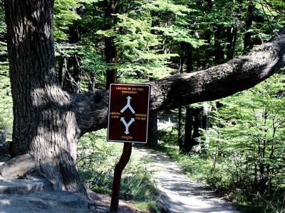 И вот она предфинишная бифуркация: "Налево пойдёшь — получишь вид на Фитц-Рой прямо над лагуной Капри, и возможность приземлиться в тамошнем кеминге. Направо пойдёшь — получишь вид на Фитц-Рой с более высокой точки, и возможность продвинуться к дальним смотровой площадке и-или кемингу." Опционы нам в тот раз были противопоказаны, и мы пошли направо, т.е. вверх, оставив себе все спуски на обратный путь.
