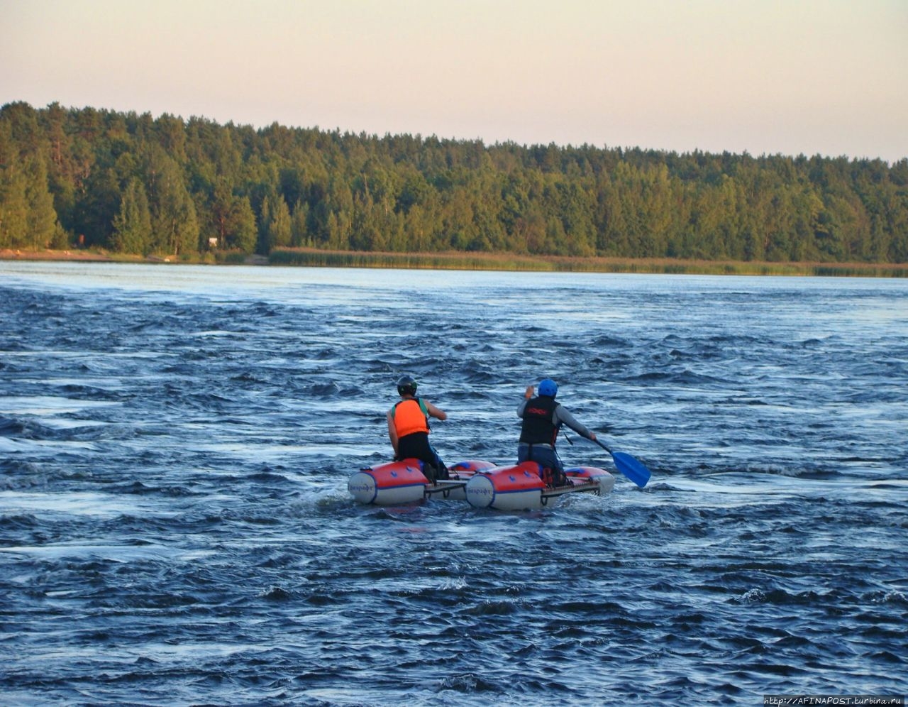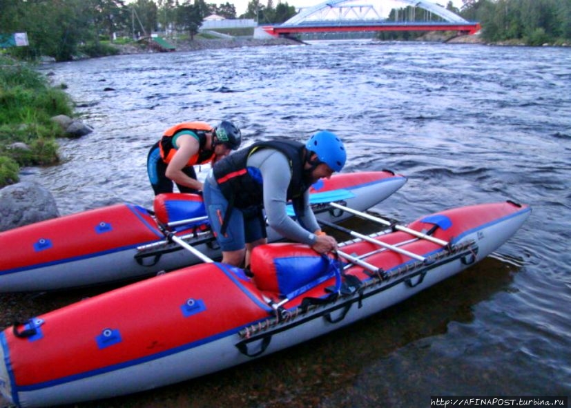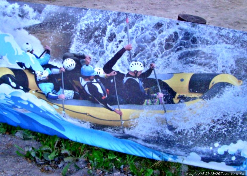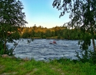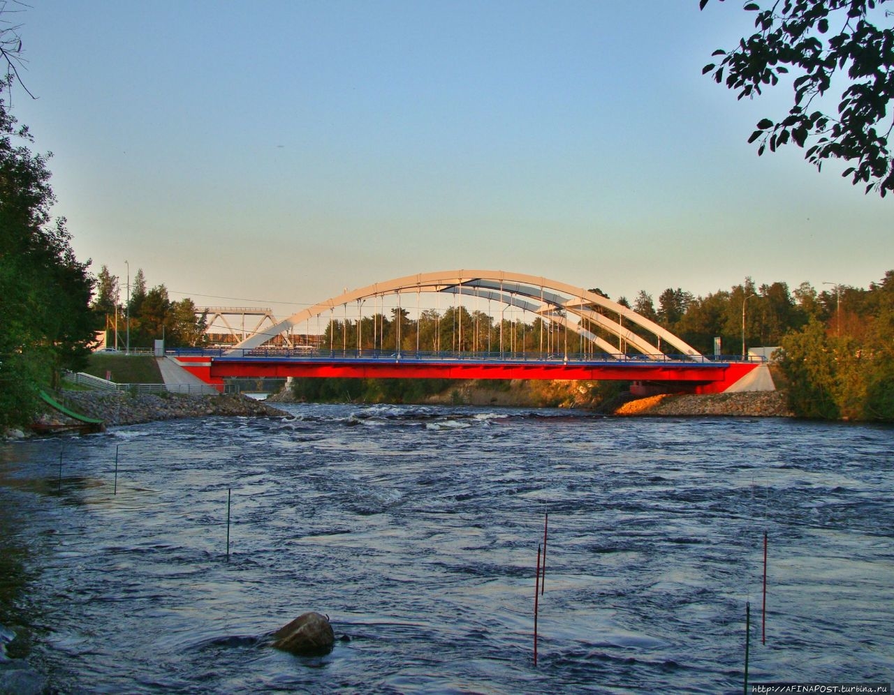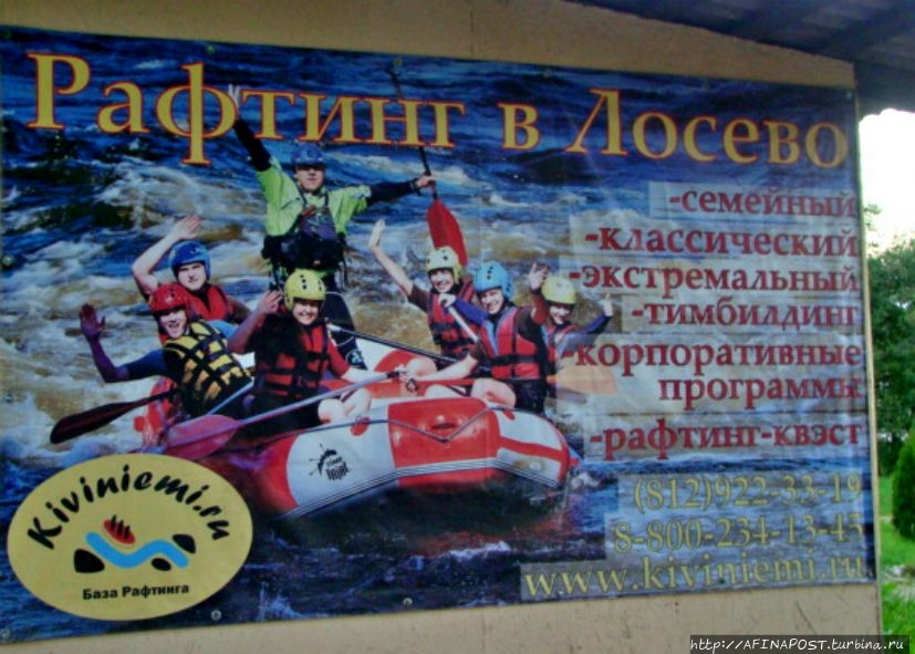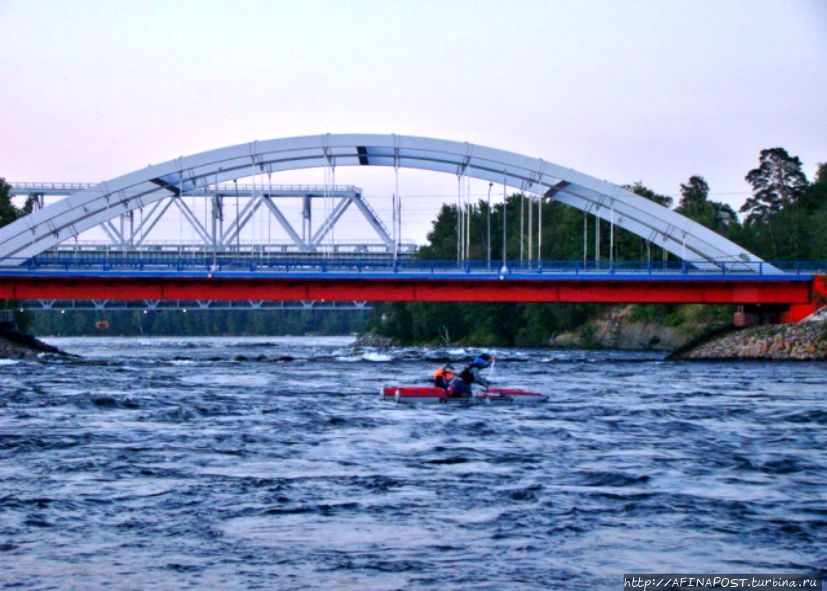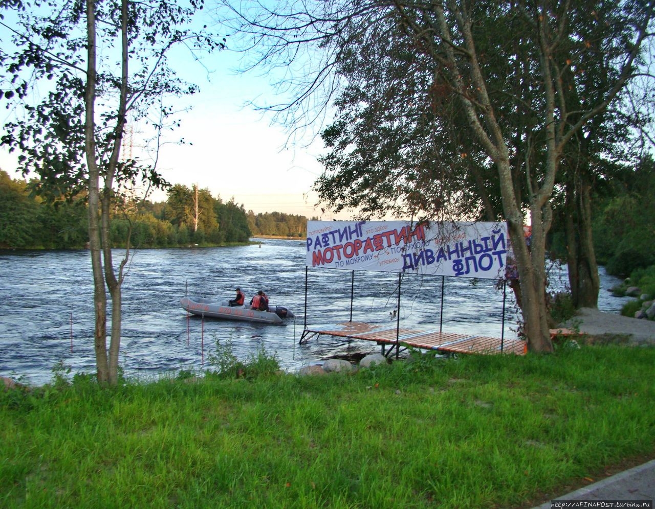 Сейчас река Вуокса так же бурлива и своенравна. В прошлом году здесь проводился Чемпионат России по рафтингу, от соревнований ещё остались плакаты. Спортсмены тренируются активно, даже в сумерках. Река мотает их лодки и катамараны как хочет, но люди не сдаются, противостоят стихии!