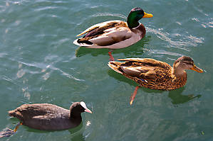 Рядом с утками были замечены новые для меня птицы, которых не всякий сможет идентифицировать сходу: это были лысухи (coot). По крайне мере я не знал их... Они не относятся к уткам, хотя чем-то на них похожи, это семейство пастушковых и отряд журавлеобразных. Питаются они в основном водными растениями и проводят больше времени на воде чем в воздухе, и вполне способны отобрать пищу и у уток и у лебедей. По моим наблюдениям в скорости уткам они не уступали, хотя у них на лапах нет широких перепонок, вместо них используется совершенно другая конструкция — фестончатые лопасти.