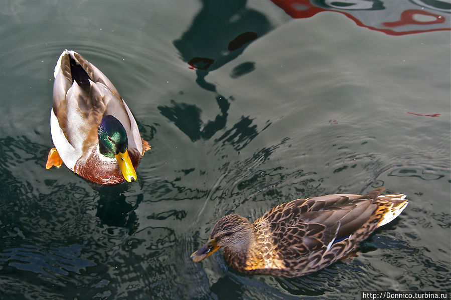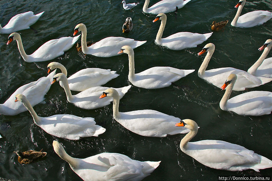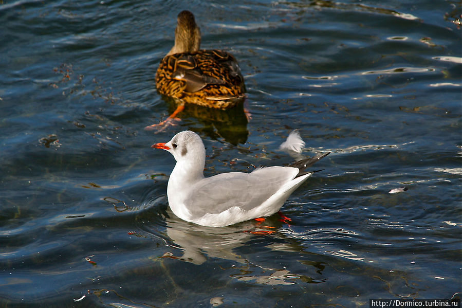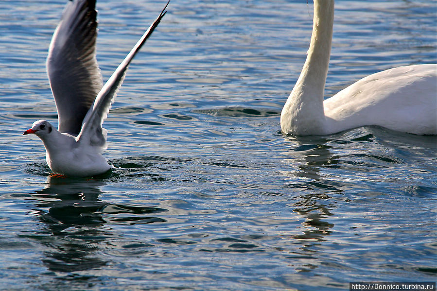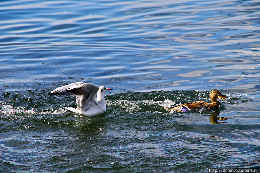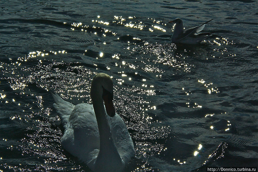 На суше же свои крошки подбирали голуби, не боящиеся ради этого подойти к самому краю набережной и вступить в единоборство с длинными шеями лебедей.