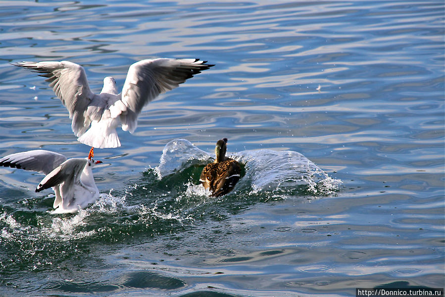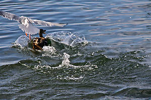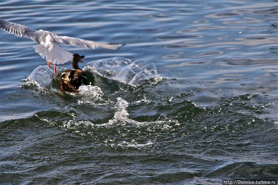 Уток они считают своими прямыми конкурентами и бессовестно гоняют их с территории, которую эта банда совершенно необоснованно закрепила за собой. Поскольку чаек намного больше, уткам приходится порой туго и, используя все навыки своей мобильности, они улепетывают куда-бы подальше, только бы их не заклевали. Думаю уместно будет сравнить чаек с бандой уличных подростков и констатировать что на швейцарском озере ни полицейский ни общественный контроль пока еще не налажен...