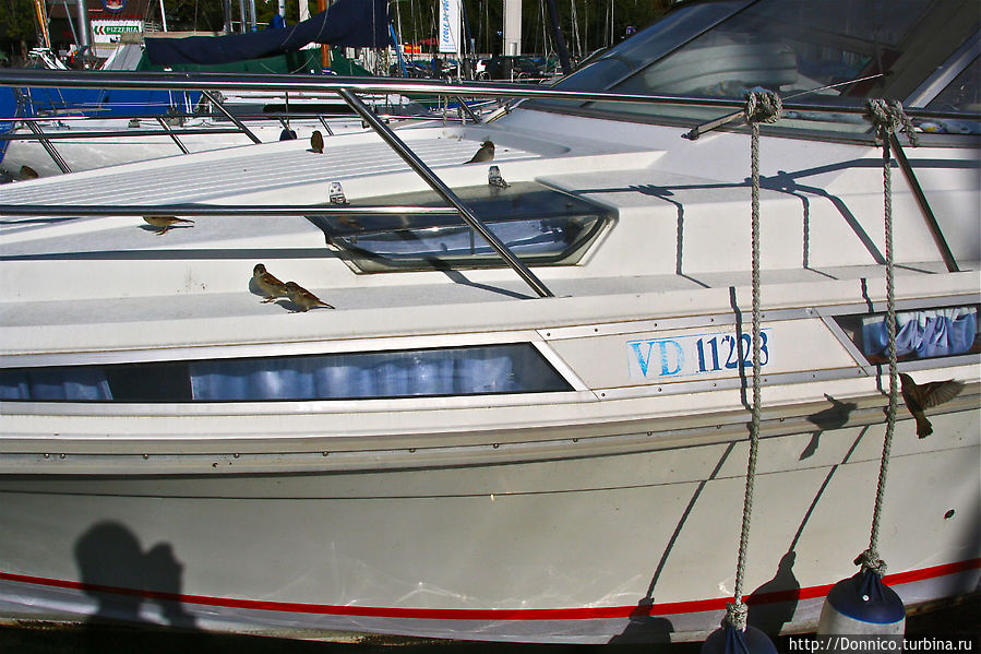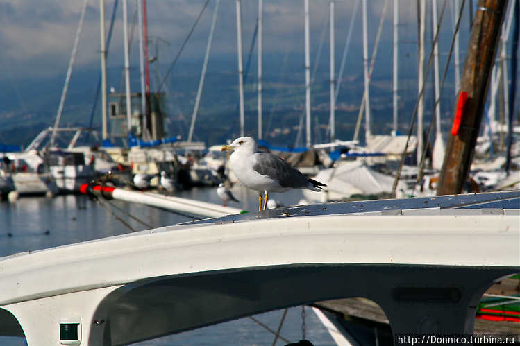 Одна чайка, которая не участвовала в общей сваре и спокойно тем временем сидела на белоснежной яхте как будто все происходящее ее совершенно не трогало, была на них непохожа и похоже что это была серебристая чайка (european herring gull), которая значительно крупнее чем озерная и потенциально еще агрессивнее. В данном случае, либо она была сыта, либо просто не парилась из-за хлеба.