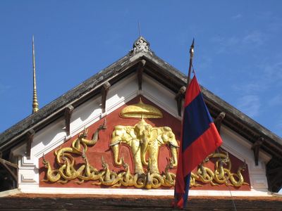 Золотой слон на красном фоне олицетворяет королевскую власть в Лаосе, а 15 голов змея символизирует 15 провинций страны, существовавшие в стране до 1975 года, когда к власти пришли коммунисты. Интересная деталь – входные ступени лестницы выполнены из итальянского мрамора.