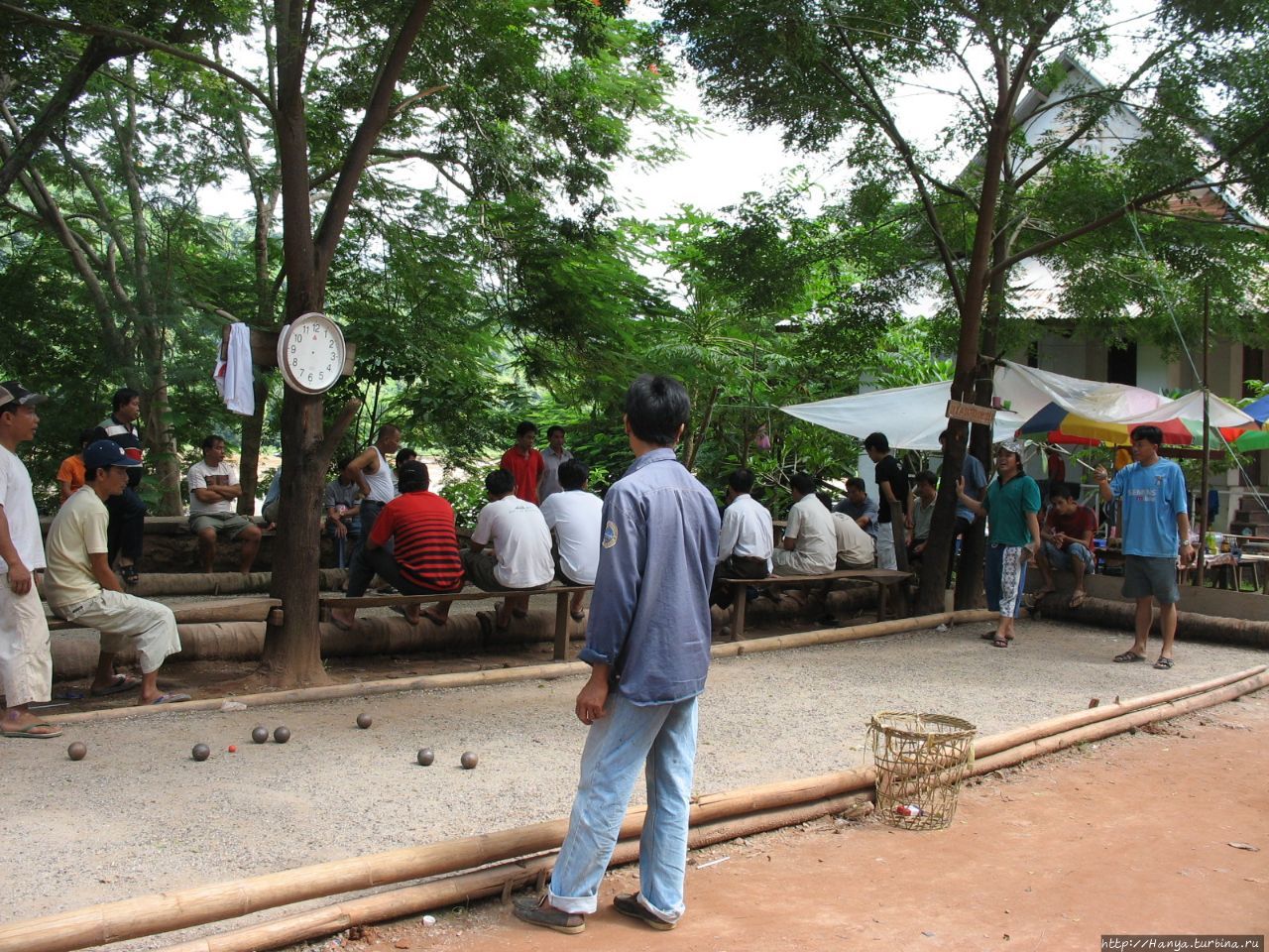 Покинув дворец через другой выход, оказываемся у Меконга. В небольшом садике обнаруживаем большое скопление лаосцев, занятых питьем пива и странной игрой типа «попади железным шаром в абрикосовую косточку».