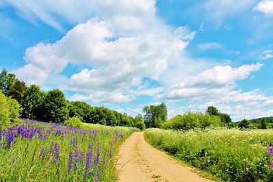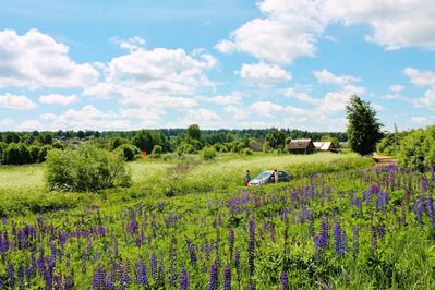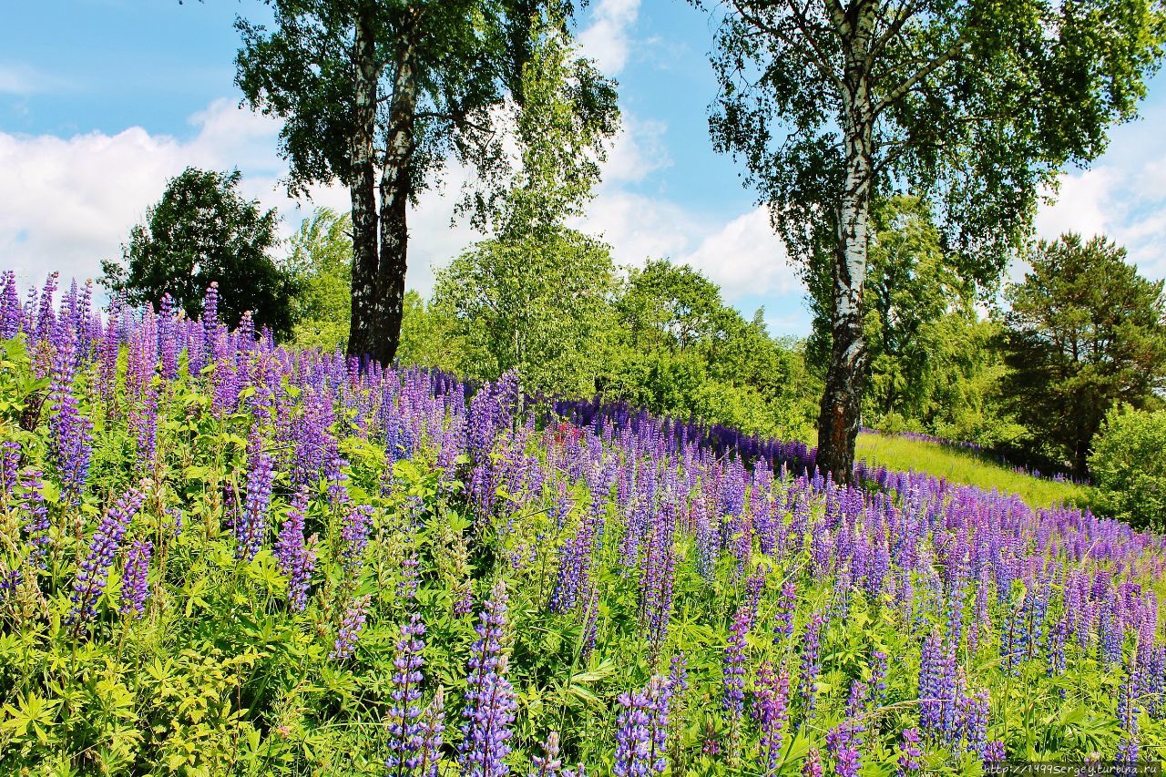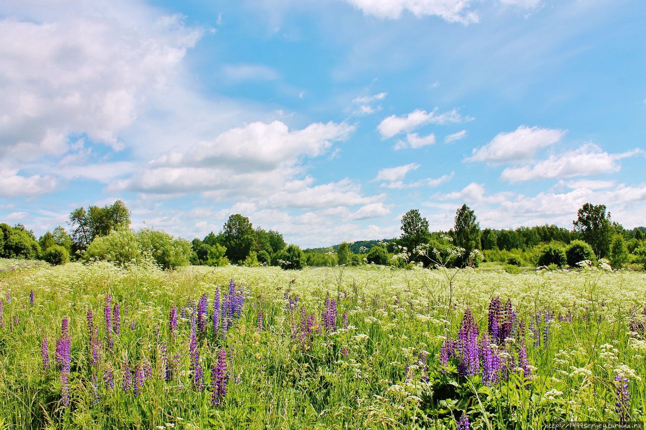 Выбранная нами дорога оказалась относительно неплохой, грейдер почти идеально её выровнял, но мы всё равно следовали малой скоростью. Впрочем, это нисколько не омрачало нашего путешествия, напротив давало возможность не спеша наслаждаться окружающей природой, а она, надо признать, не скупилась в проявлениях всех своих лучших сторон. В её арсенале присутствовали светлый лиственный лес и многочисленное разнотравье, особенно нас поразили люпины, что буйными зарослями встретили нас у самой деревни.