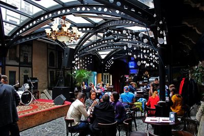 Такая вот забавная кофейная шахта есть под главной площадью Львова. Но почему все столики пустуют? — возникает логичный вопрос. А ответ в крытом дворике, в который можно выйти как через "шахту", так и прямо из третьего зала. Здесь практически все столики, даже не смотря на совсем не прайм-тайм, заняты.