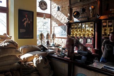 Прямо на центральной площади города Рынок, в помещении дворца Любомирских в 2011 году открылось кафе-книгарня-копальня с такой креативной легендой: Львовский кофе рождается здесь! Единственная в мире шахта кофе, где на глазах посетителей кофе добывают прямо под площадью Рынок