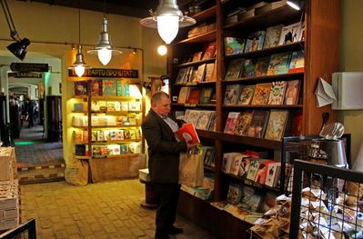 Если мы не удовлетворяемся покупкой только-что обжаренных зерен, проходим в следующий зал. А здесь — книгарня. Свои книги представляет местное "Издательство Старого Лева". Такое вот непривычное соседство...