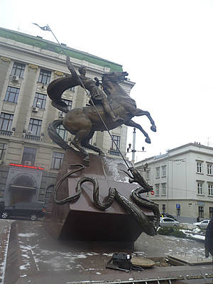 Выразительный памятник Георгию Победоносцу посвящен не ему, а погибшим в борьбе со злом львовским милиционерам и находится у здания областного МВД.