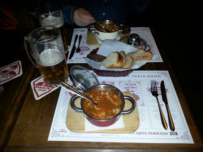 И таких направлений во Львове множество: это и «Кафе у Мазоха» с садо-мазо фетиш издевательствами (как там — не знаю, не решился) и прочее, и прочее. В заключение расскажу о пивоварне «Кумпель». Интересное место, работающее 24 часа (после полночи меню урезанное) в сутки. И в отличие от пивоваренных домов в Праге, делающих в первую очередь акцент на пиве, в «Кумпеле» можно вкусно поесть под одноименное пиво.