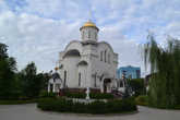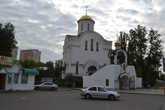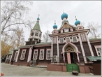 Сперва, когда я наскочил на этот храм, то решил, что это седой древности постройка северной традиции русского церковного зодчества — она и выглядит именно так: деревянные стены, характерные шатровые очертания, многие числом, так что кажется, что храмов там не один, а три. Весь стиль вроде бы на это и наводит. По рассмотрении вопроса, впрочем, оказалось, что церкви-то этой всего полтора десятка лет, и создана она в ожидании постройки более внушительной и по статусу важной — Преображенского…