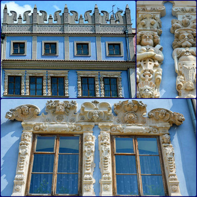 Некоторые стоит отметить отдельно. Дом Конопника — этот голубой красавец сразу же бросается в глаза. Во-первых из-за своего цвета и белокаменной отделки, которая так украшает его. Приглядевшись к ней можно увидеть фигурки и лица людей, маски, головы драконов.