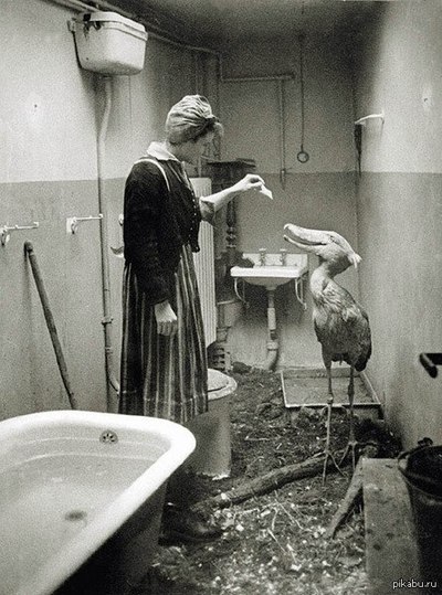Можно только представить, насколько редкая удача найти китоглава в бескрайних просторах болот на краях озера Виктория, птицу, название которой даже не слыхало более 99 % населения. Китоглава ведь не только сложно отыскать в природе, он очень редкий гость в зоопарках. Не скажу, во скольких зоопарках можно наблюдать его живьем (гугл выдает зоопарк в Праге, может еще где есть...). В просторах инета я повстречал интересное старинное фото, подписанное так: "Китоглав из берлинского зоопарка переживает бомбежки в ванной у медсестры 1945 г."
