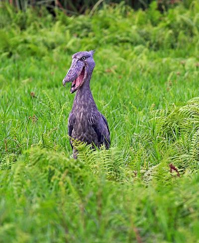 "Китоглав, или королевская цапля (лат. Balaeniceps rex) — птица из отряда аистообразных, единственный представитель семейства китоглавых (Balaenicipitidae). Очень крупная птица, её высота в среднем составляет 1,2 м, размах крыльев 2,3 м, а вес 4—7 кг[2]. Обитает в тропических болотах Восточной Африки, где водятся двоякодышащие рыбы протоптеры — его главный корм.." (ru.wikipedia.org/wiki/Китоглав)