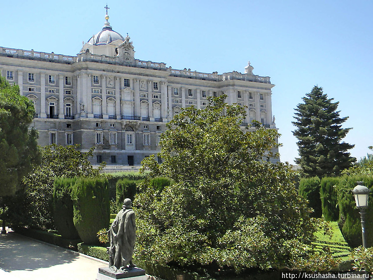 Снаружи дворец тоже очень красив. Напротив возвышается Кафедральный собор Альмудена. Всё вместе образует великолепный архитектурный ансамбль.