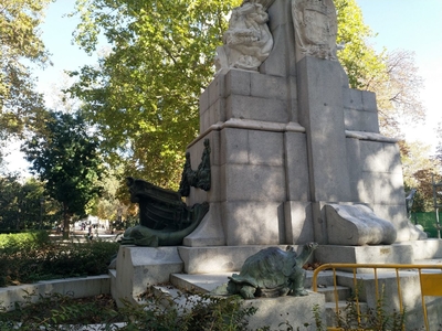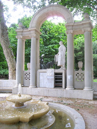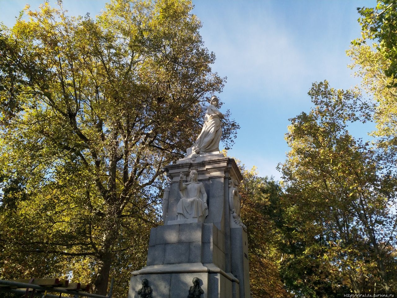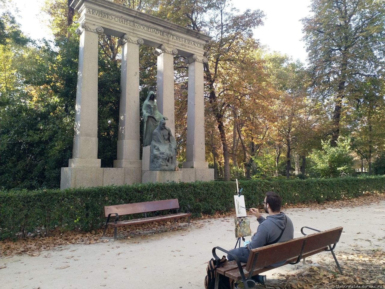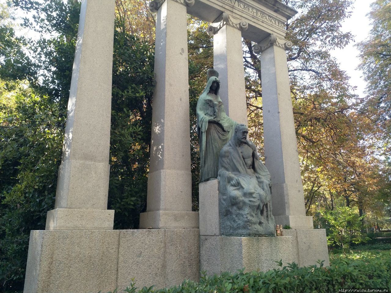 Это посмертная работа скульптора Хулио Антонио Родригеса Эрнандес, которая была сделана в 1921 году из песчаника. Со временем скульптура стала разрушаться и Эдуардо Капа повторил её из бронзы. Напротив сидит художник и делает наброски этого памятника. Рассмотрела и я. Полуобнажённый восседающий композитор за спиной которого торжествует в женском обличье аллегория испанской музыки. В руках она держит символ Победы Самофракийской.
