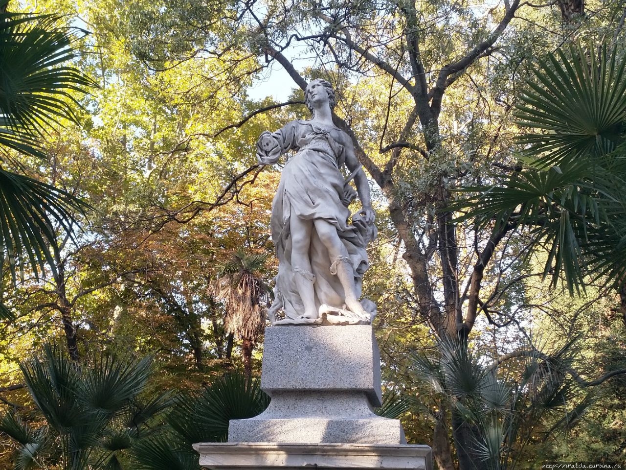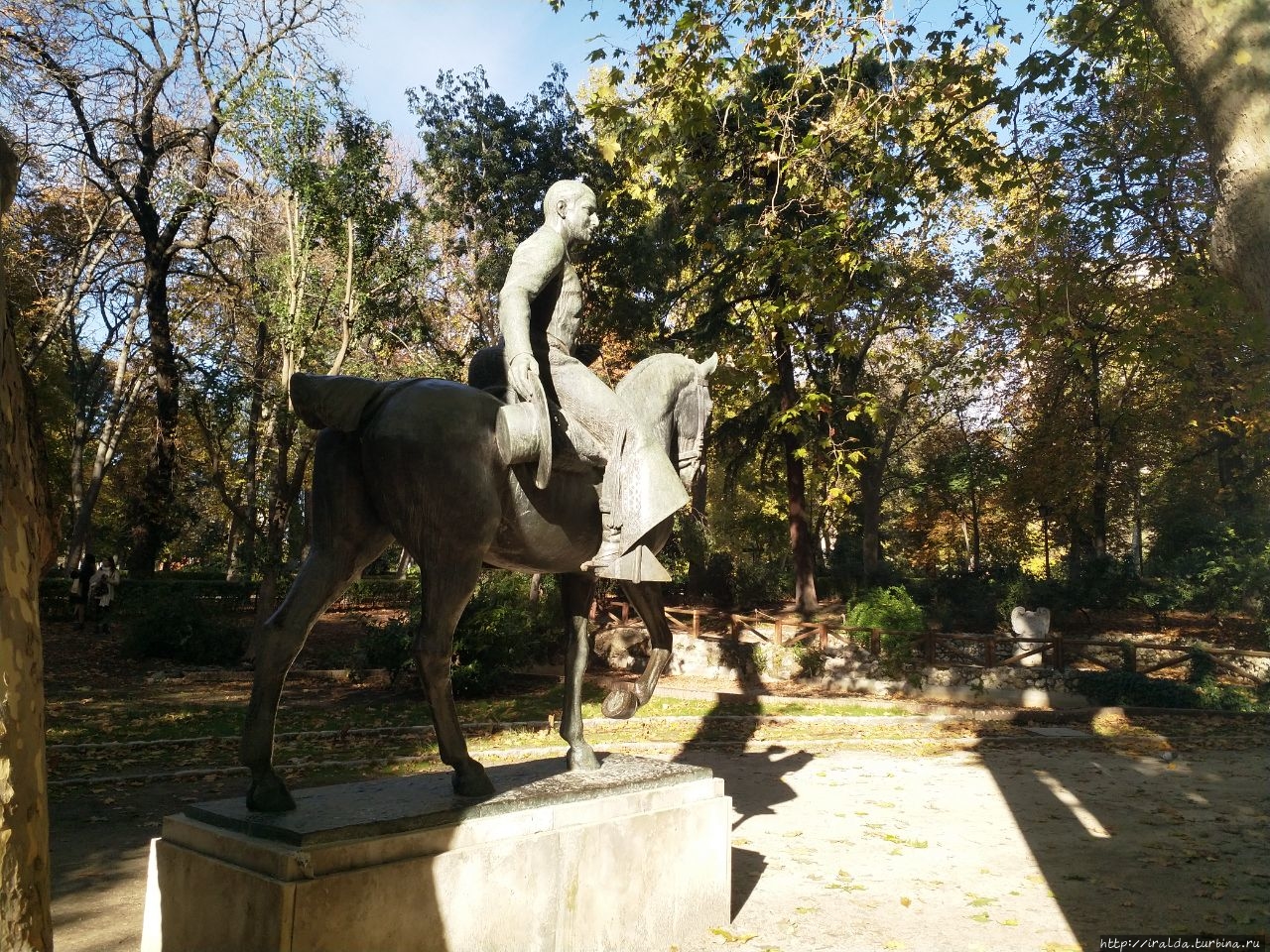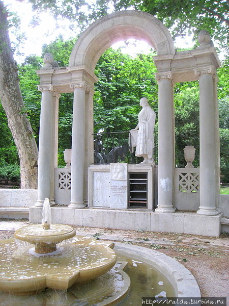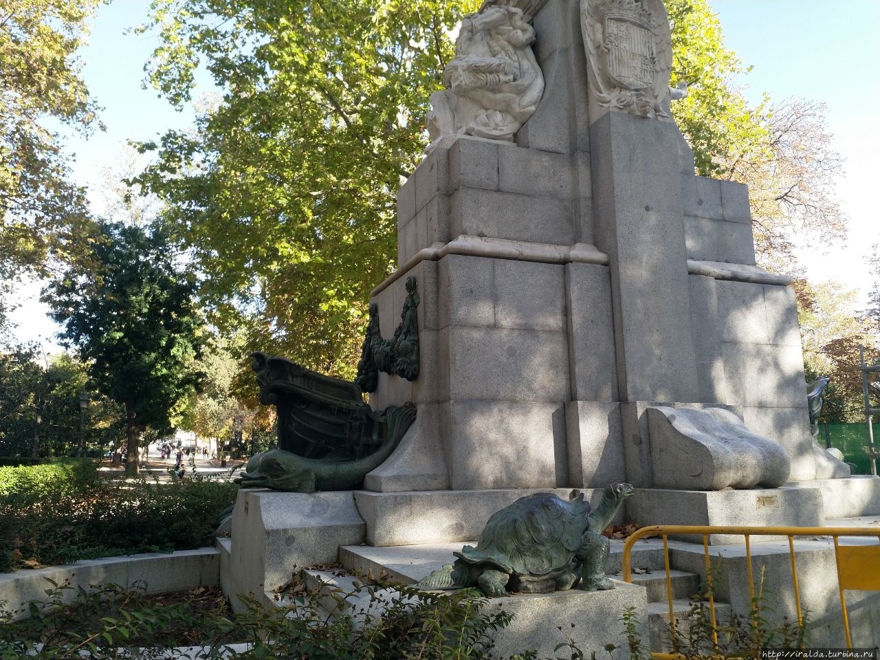 Это посмертная работа скульптора Хулио Антонио Родригеса Эрнандес, которая была сделана в 1921 году из песчаника. Со временем скульптура стала разрушаться и Эдуардо Капа повторил её из бронзы. Напротив сидит художник и делает наброски этого памятника. Рассмотрела и я. Полуобнажённый восседающий композитор за спиной которого торжествует в женском обличье аллегория испанской музыки. В руках она держит символ Победы Самофракийской.