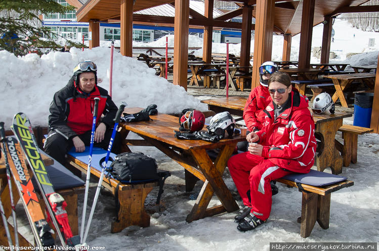 Обычно наш «трудовой день» имел следующий распорядок, с 9.00 до 9.30 у нас был завтрак в замечательном кафе, где кормят ещё за "совковыми" столиками, из "совковой" посуды, да и, честно говоря, по "совковому" сытно, вкусно и от души. А после в 9.30 уже выезд на гору на корпоративном транспорте. И как в СССР питание было четырехразовым: завтрак, обед, полдник и ужин. Я посетил более 90 стран и мне доводилось жить в самых лучших отелях по всему миру, но нигде, кроме как на Родине, не предложат такого великолепного блюда, как кефир. После пятичасового катания на горе обед и потом теоретические занятия.