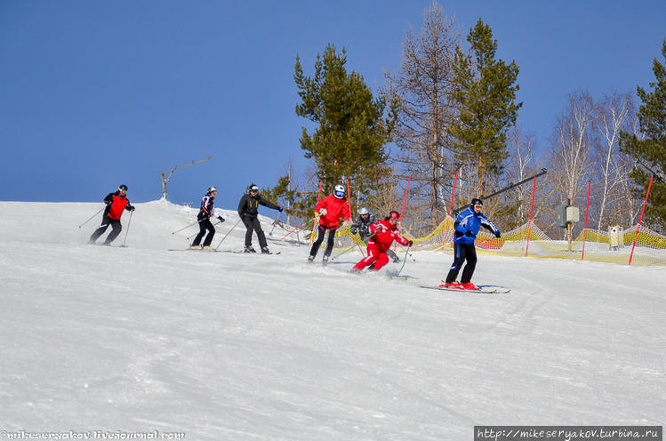 В России не так много горнолыжных курортов, но опять таки из-за того, что не так много высоких гор, и на «экваторе» обучения мы поехали на свободное катание в Абзаково – тоже горнолыжный курорт, расположенный не так далеко от озера Банного. Это была первая за 7 дней возможность "бесконтрольно" кататься по любым трассам и на любых скоростях).