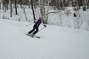Инструктор Лёша Штопин демонстрирует технику скользящего поворота. Позиция хорошая, а вот в фокус я не попал(((, что плачевно, пришлось поднять "шарпность" до максимума, но здесь главное не качество, а момент движения).