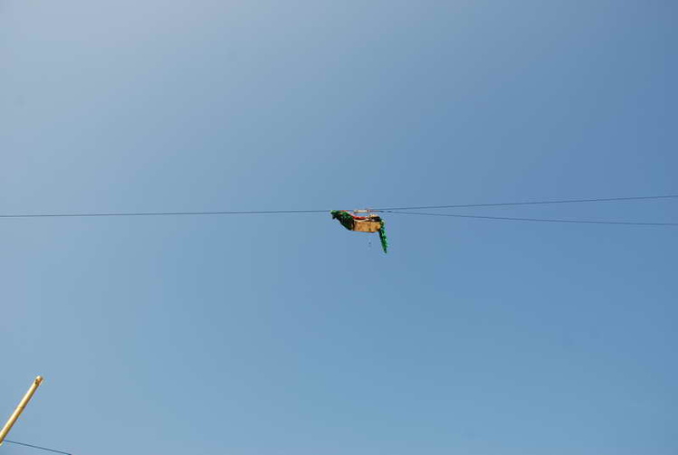К тросу прикреплен стилизованная лодочка. Гид мне объяснил, что желающие совершить доброе дело, помещают на этот кораблик пакетик (или пакетики) с сусальным золотом. Кораблик по тросу поднимается наверх, и сусальное золото используется для покрытия пагоды золотом.